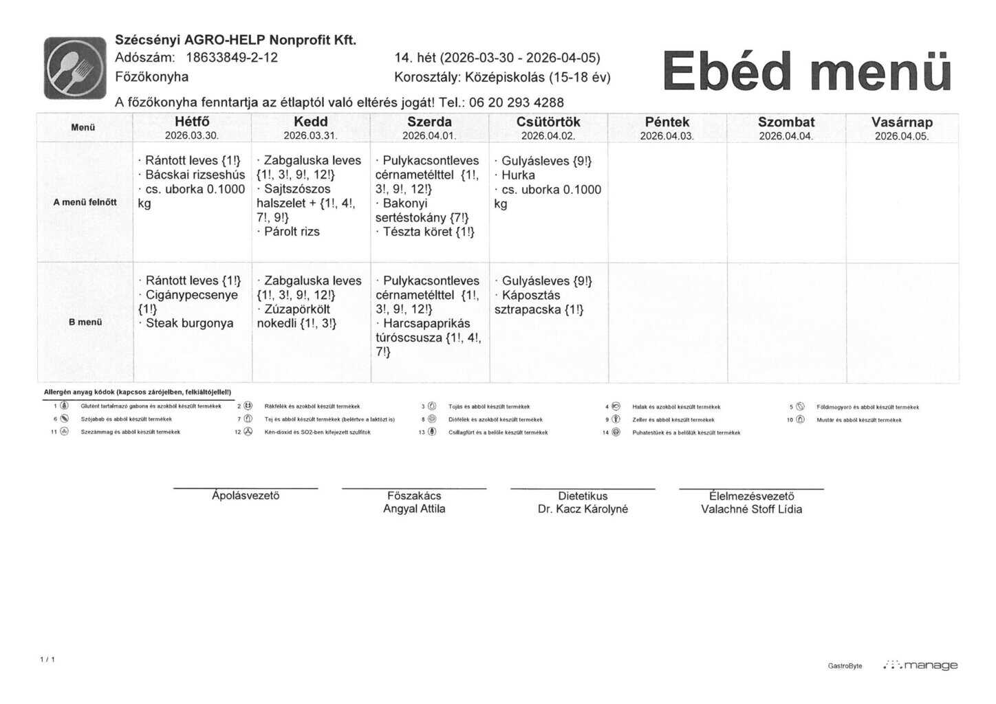 A SZOCIÁLIS ÉTKEZTETÉS 14. HETI ÉTLAPJA