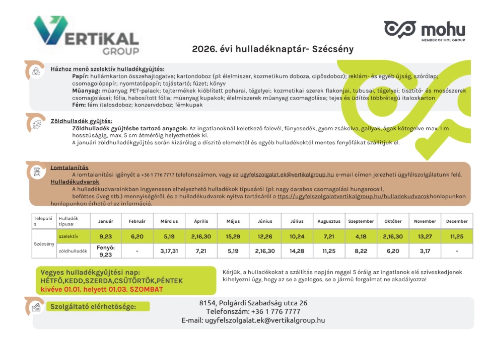 A 2026. január 1-jére (csütörtöki napra) esedékes hulladékgyűjtés a munkaszüneti napra tekintettel 2026. január 3-án (szombaton) kerül elvégzésre.